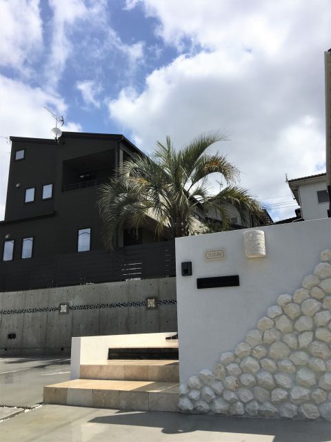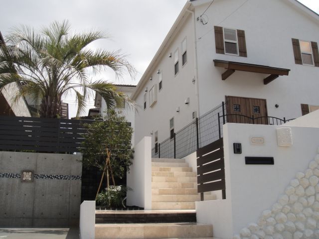 門塀にはライムストーンを貼り、階段には白の大理石タイルを使用しました。