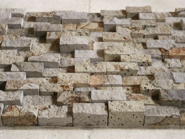 バリ風インテリア・エクステリアに最適な壁用タイルです。裏面はネット付きで、お好きなサイズにカットしてご使用頂けます。1個が 10×10×3cm の石を交互に張り合わせて出来てます。※天然の石材ですので、色に違いがあります。